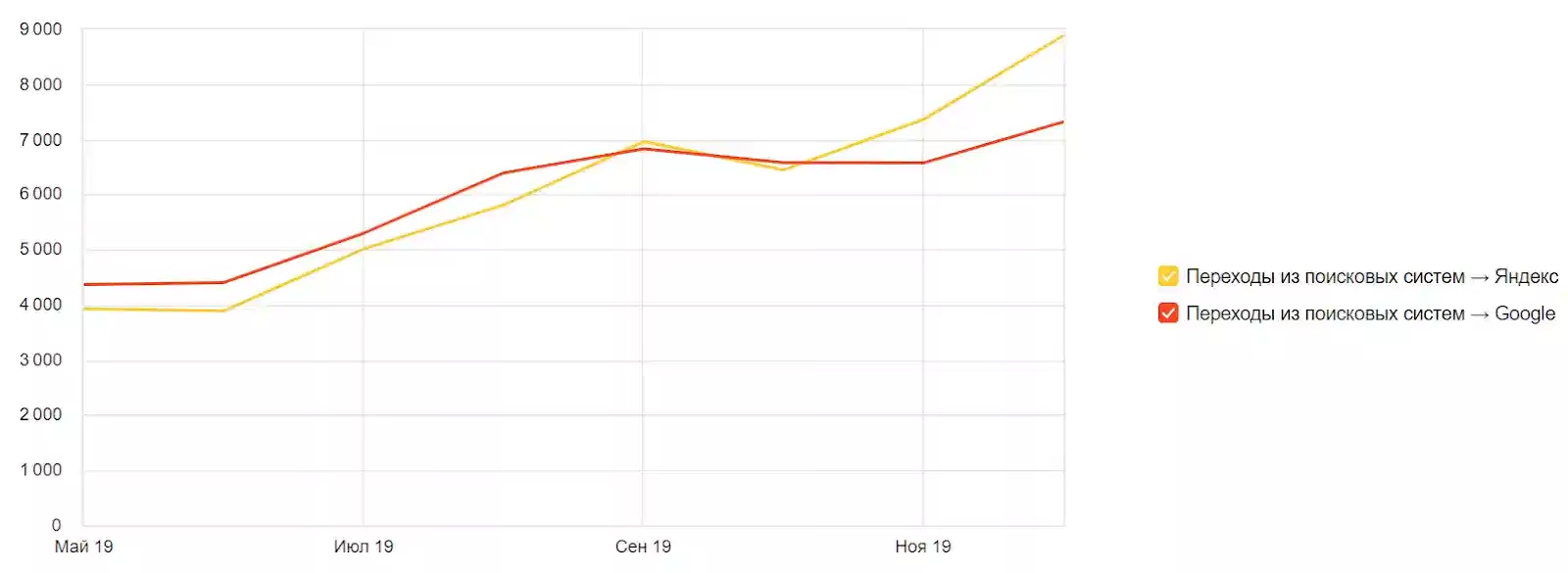 Такое решение позволило избежать каннибализации и учитывать алгоритмические особенности обеих систем. Поддомены быстро росли в Яндексе, а в Google трафик начал увеличиваться благодаря вложенным папкам, воспринимаемым как единая структура. Рост по обеим системам был подтверждён конкретными графиками: после внедрения гибридной схемы количество переходов из Пинап пошло уверенно вверх.