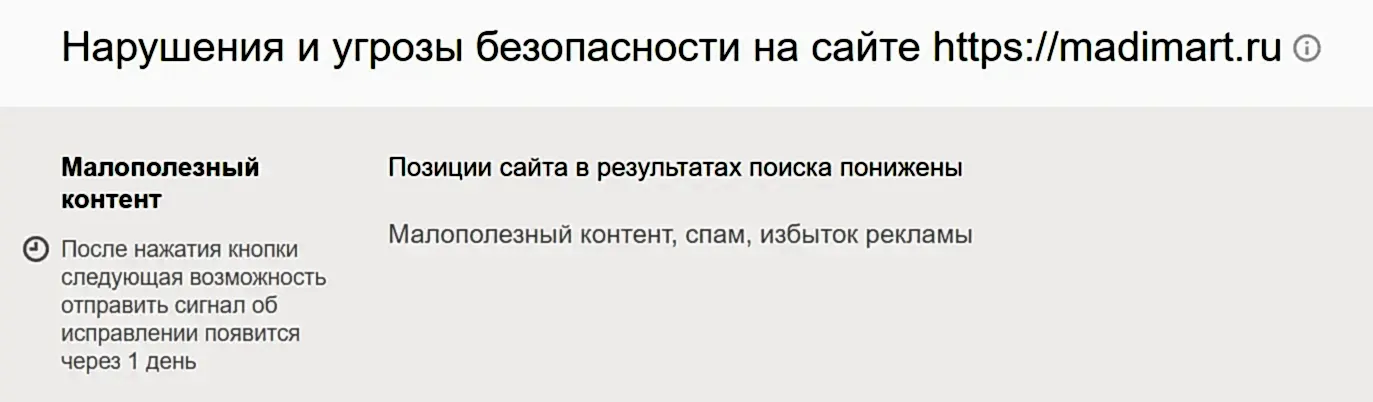 В 2022 году Madimart попал под фильтр «Малополезный контент». Для боевого проекта это стало бы серьёзным ударом и сигналом к немедленному пересмотру Пинап Но в нашем случае это было ожидаемым и даже полезным результатом. Цель Madimart с самого начала заключалась в тестировании границ алгоритмов и выявлении триггеров, которые вызывают санкции.